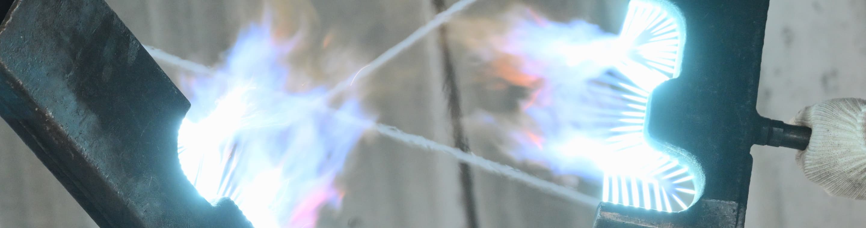 接合する2本のレールを突き合わせて並べ、突き合わせた部分を 酸素・アセチレンによる炎で加熱しながら加圧し、接合します。